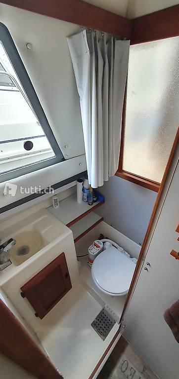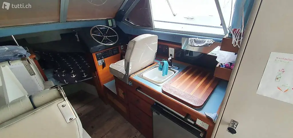 Interieur sehr guter Zustand, grosszügige Kabine bietet vorne genügend Platz für 2 Personen plus evt. 1 Kind, oder 3-Kinder. der Esstisch kann in ein Bett umgebaut werden 2x1.4m. Unter dem Tisch gibt es nochmals Platz für 1 Person oder 2 Kinder.