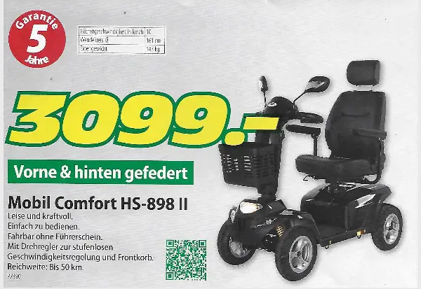 Elektro Seniorenmobil Comfort HS-898 II Erstzulassung 2021 mit Garantieschein bis 05.07.2026 Letzter Service: 6. März 2024 Wenig gebrauchtes Seniorenmobil zu verkaufen. Ideal für Ausflüge und selbstständige Mobilität im Alltag. Das Elektromobil ist in gutem Zustand und wurde stets gepflegt. Es bietet Komfort und Sicherheit. Perfekt für ältere Menschen oder Personen mit eingeschränkter Mobilität, um aktiv und unabhängig zu bleiben. Bei Fragen Peter Weiss 079 215 25 75