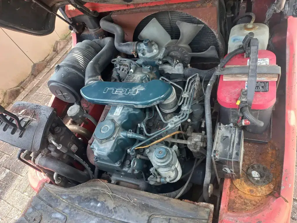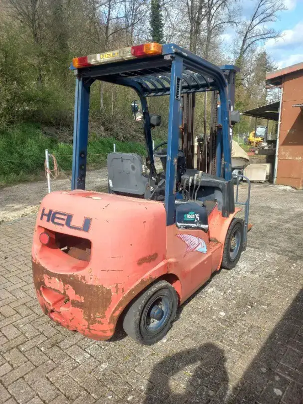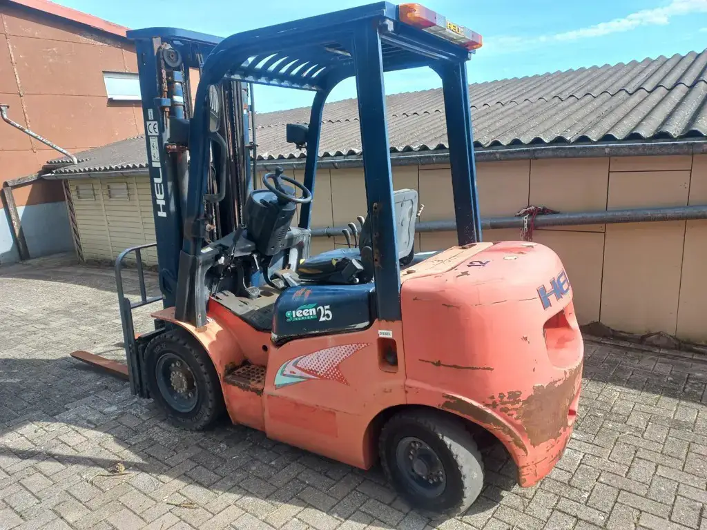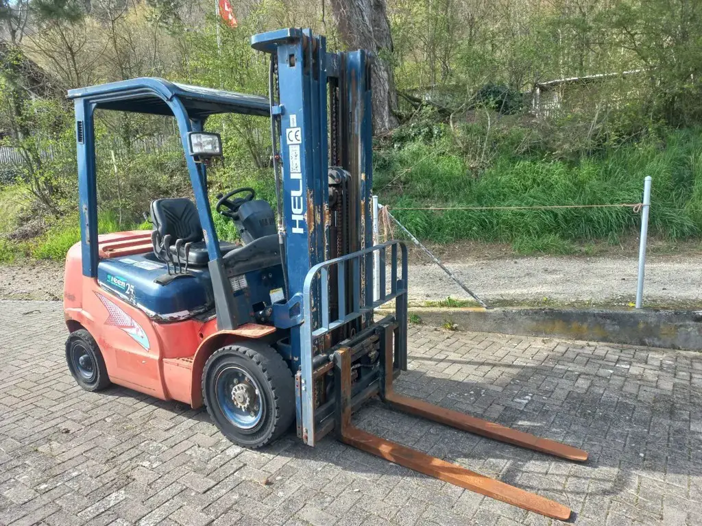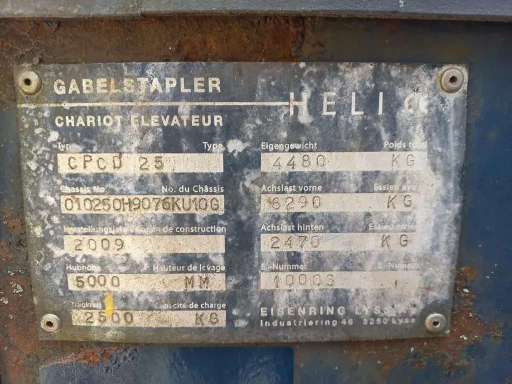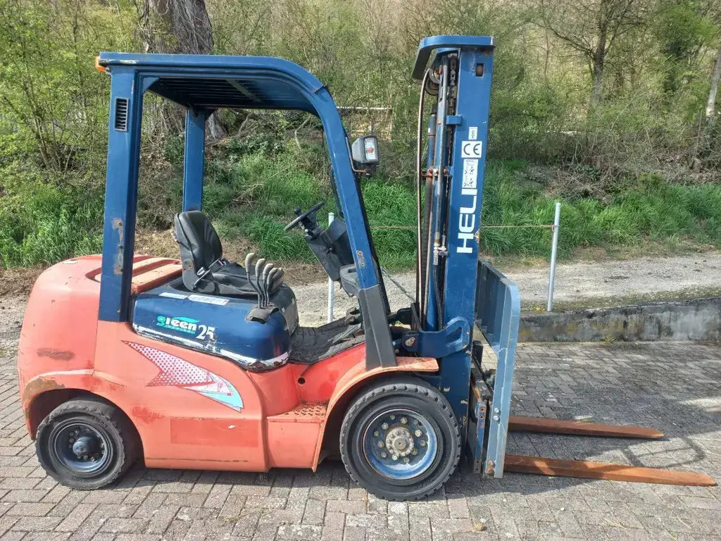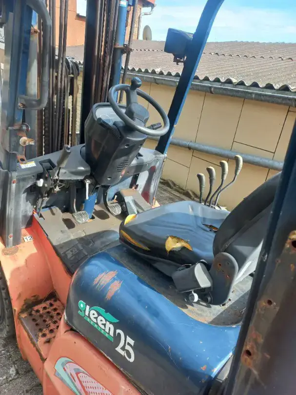 Hubstapler / Gabelstapler / Dieselstapler Heli CPCD 25, 2,5 T Hubkraft, mit Kubota 4 Zylinder Dieselmotor, Baujahr 2009, 4. Steuergerät (für Drehgerät / Krokozange Gabelverstellgerät usw.) Triplexmast mit Seitenschieber, Hubhöhe 5,0 m, Bauhöhe ca. 225 cm, Lange Gabeln 1,2m, noch im Originalen - jedoch schlechtem, ausgebleichtem Lack .....