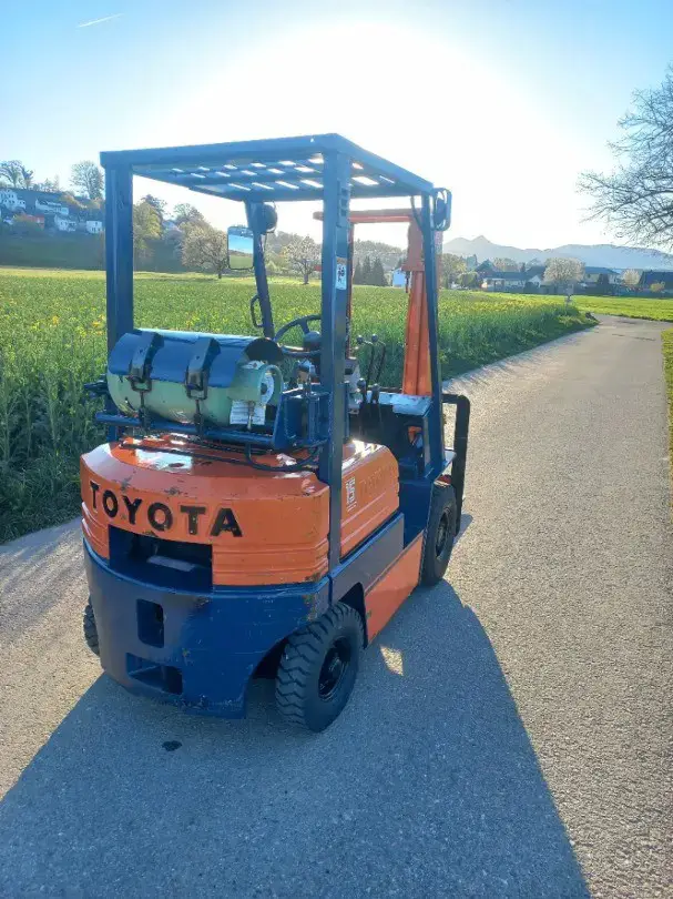 Hubstapler Toyota 5 FG14, 1,4 T Hubkraft, Treibgasstapler, mit erst 4500 Betriebsstunden, Duplexmast mit Lastschutzgitter und langen Gabeln 1,2m, Hubhöhe 3,0 m, Bauhöhe ca. 205 cm, Schaltgetriebe, Servolenkung, Startet / läuft und fährt sehr gut, Bremsen / Handbremse sind sehr gut .... Stapler ist Hinten neu + Vorne80% mit Luft - Bereifung ausgestattet .... sehr guter Zustand, ab Instandstellung und Motorenservice ....